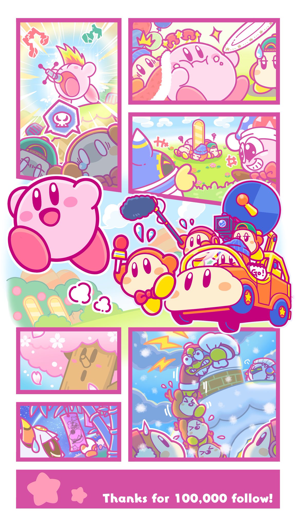 星のカービィ つ つ ついに 当アカウント 10万フォロワーを突破いたしました っ カンゲキですーっ なんと今回 アドレーヌさんがお祝いイラストを描いてくださいました 壁紙としてもお使いいただける特別仕様ですっ これからもはりきって